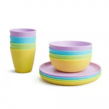 The set is a comprehensive collection of dining essentials, including 4 plates, 4 bowls, 4 cups, and 4 Splash utensils, all in a delightful array of colors. These pieces are not only visually appealing but also ergonomically designed to fit small hands, making it easier for your toddler to grasp and use them. The flatware is specially designed to pick up food with minimal effort, supporting your child’s independence at the dining table.