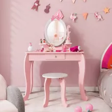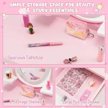 Our Kids Vanity Set stands out with its 360° rotating mirror, offering perfect views from every angle. The perfect height of 27.5 x 17 x 40 inches, with a tabletop at 22.5 inches, makes it just right for little ones. It’s not just a makeup table; with a detachable top, it transforms into a writing desk, providing dual functionality. The ample storage space, including a large drawer and open shelves, keeps essentials organized and within easy reach. Safety is paramount, with a sturdy wooden structure, non-toxic paint, rounded corners, and easy-to-clean surfaces, making it a worry-free choice for parents.