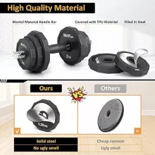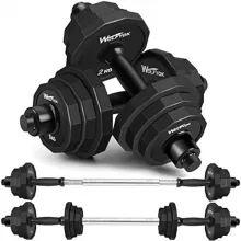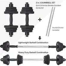 What sets our dumbbell set apart is the combination of quality, versatility, and convenience. The robust steel construction guarantees long-term durability, while the adjustable design offers a range of training options, from light to heavy, making it suitable for all fitness levels. The ability to convert it into a barbell adds another dimension to your workouts, allowing for a wider range of exercises. Plus, the thoughtful design ensures safety and ease of use, making your workout experience smooth and enjoyable.