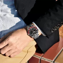 This watch is more than a timepiece; it’s an experience. Whether you’re crossing continents or conquering daily tasks, its functionality ensures you’re on time, every time. The striking burgundy and blue outer ring sets it apart, adding a touch of sophistication to your wrist.