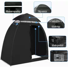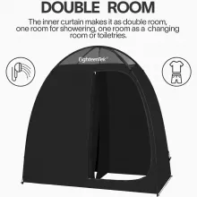 Say goodbye to flimsy construction and complicated setups. Our patented portable shower tent introduces a middle curtain, creating two separate rooms for added privacy. The double side zippers on the entrance doors provide easy access, while the black fabric ensures discreet use. Inside, discover a hanging rope and two mesh pockets for your convenience.