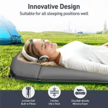 Our Deluxe Self-Inflating Camping Mat stands out for its unparalleled comfort and convenience. Its high-density memory foam adapts to your body, providing exceptional support and insulation from the cold ground. The built-in 6-inch pillow adds an extra layer of comfort, ensuring a restful sleep even in the rugged outdoors. With its waterproof and rip-stop fabric, this mat is designed to withstand the elements and last for years.