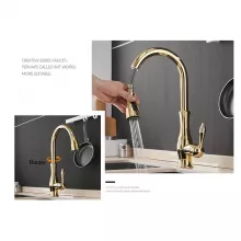 Introducing our Gold Pull Out Kitchen Faucet, a blend of sophistication and versatile functionality designed to elevate your kitchen’s aesthetic and practicality. Crafted with precision, following the ISO9001 quality standard, this faucet combines the timeless beauty of a polished chrome finish with the durability of solid brass construction. Its sleek design, accentuated by a luxurious gold color, not only adds a touch of elegance but also offers unparalleled reliability for everyday use.
