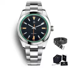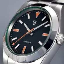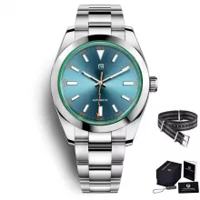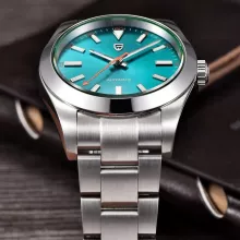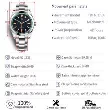 At the heart of this timepiece is the reliable Seiko NH35A movement, ensuring precise timekeeping with a mechanical hand wind and automatic self-wind capability. Encased in sturdy stainless steel, the watch features a resilient sapphire crystal dial window, known for its scratch resistance and clarity. The luminous hands glow in the dark for easy reading, while the 100M water resistance makes it a perfect companion for both casual swimming and serious diving.