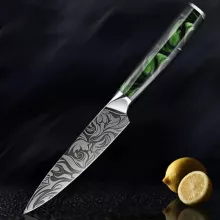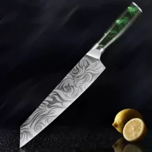 It’s the attention to detail and quality. The unique Damascus pattern on each blade is not just for aesthetics; it’s a symbol of the superior craftsmanship that goes into making these knives. The combination of stainless steel, resin, and solid wood in the handle not only makes each knife sturdy but also a piece of art.